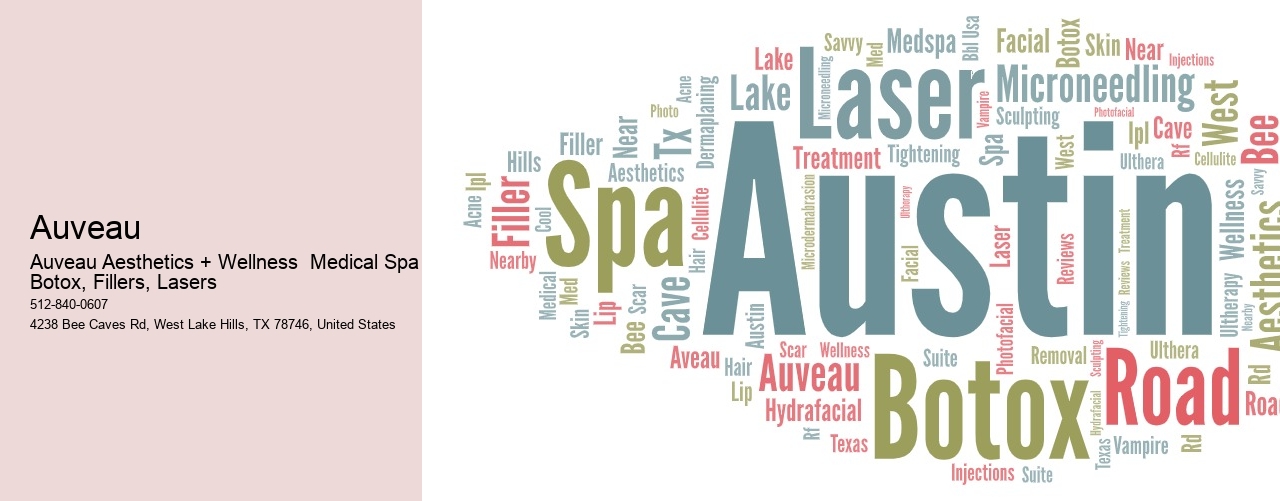 In West Lake Hills, Texas, Auveau Aesthetics + Wellness provides premier medical spa services, including Botox, Juvederm, and lip fillers. Close to popular sites like Deep Eddy Pool, Zilker Park, and the Wild Basin Wilderness Preserve, the spa attracts clients from Austin, Rollingwood, and Sunset Valley, offering tailored care in a relaxing atmosphere.
